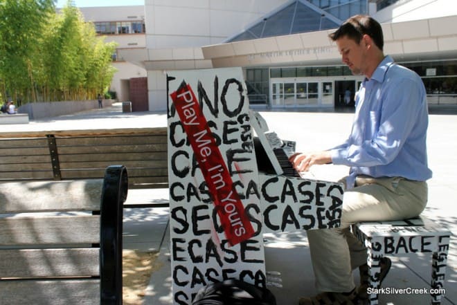 “This piano has been turned from a normal piano into a work of art,” he says while sitting at a group-painted black and white piano just outside MLK library in San Jose. “Then, when people play the pianos, that’s another form of art.” Well, except in the case perhaps of Loni who would prefer that her parents not watch this video.