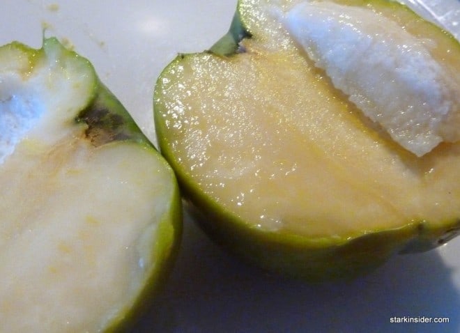 It was like sweet, creamy pear. Truly delectable. So precious little of it and so absolutely devour-worthy. I was cautious not to scoop too close to the skin as I noted the skin, unlike an apple or pear, has a bitter taste to it.