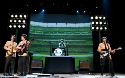 The best part of RAIN is that the band is credible, reasonably authentic and — most importantly — live. There are no pre-recorded tapes or sequences, at least that I could tell, aside from the video montages of course. Wigs, and moustaches help take us through time; from the innocent raw energy of “I Want to Hold Your Hand” at Shea Stadium to the hippie-friendly, acid inspired “I am the Walrus.”
