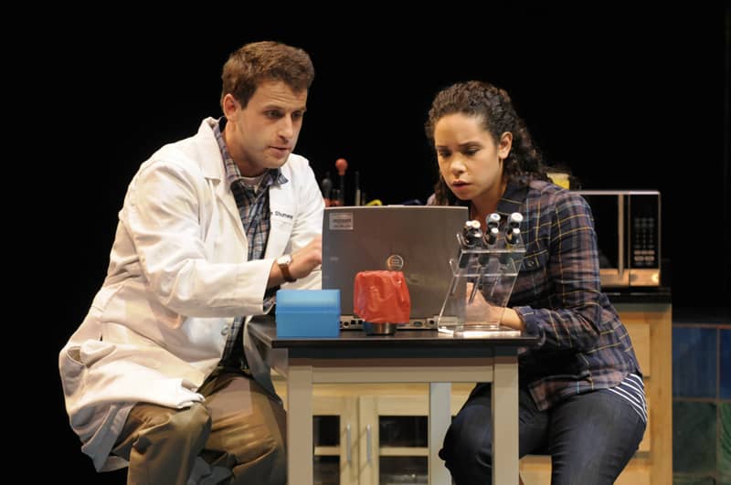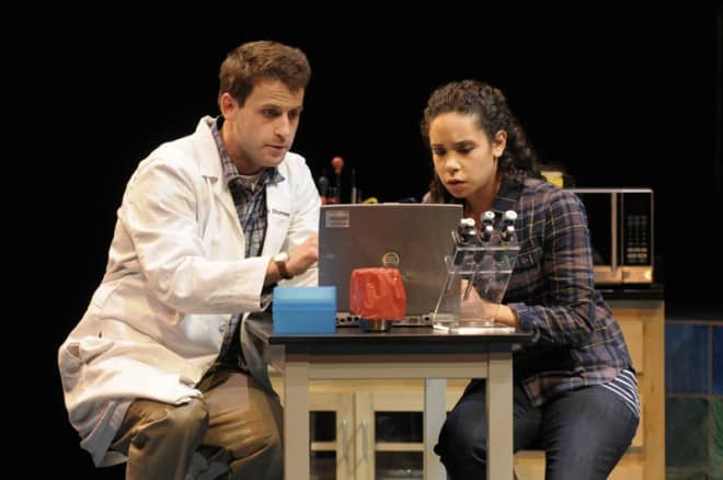I was interested to see how science would fare on stage, as a central story idea. Written by Bob Clyman, a clinical psychologist, the play is certainly smart, the dialog mostly authentic. But the cerebral nature of the material occasionally leads to emotional detachment. Key scenes that should be riveting with intense pay-offs, come across flat. Disappointing too is the lack of chemistry between James Wagner and Kathryn Tkel. Their romantic connection feels hollow and less than convincing. That’s unfortunate as it’s needed to off-set the cool motif concerning lab-coats, beakers and laptops.