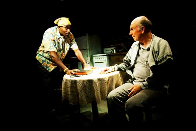 Black, who lives in a “moral leper colony,” converses with the almighty power and is content with what he gets in life, even though it’s not what he wants. Chances are everything he knows can be traced to the Bible (“The best book”), even though he doesn’t necessarily agree with all of it. A chance meeting brings a white professor to his worn-down apartment. White is an analytical skeptic, and confirmed heretic. “Why is there no ministry in hell?” he asks. For him, there is value in books, music and art.