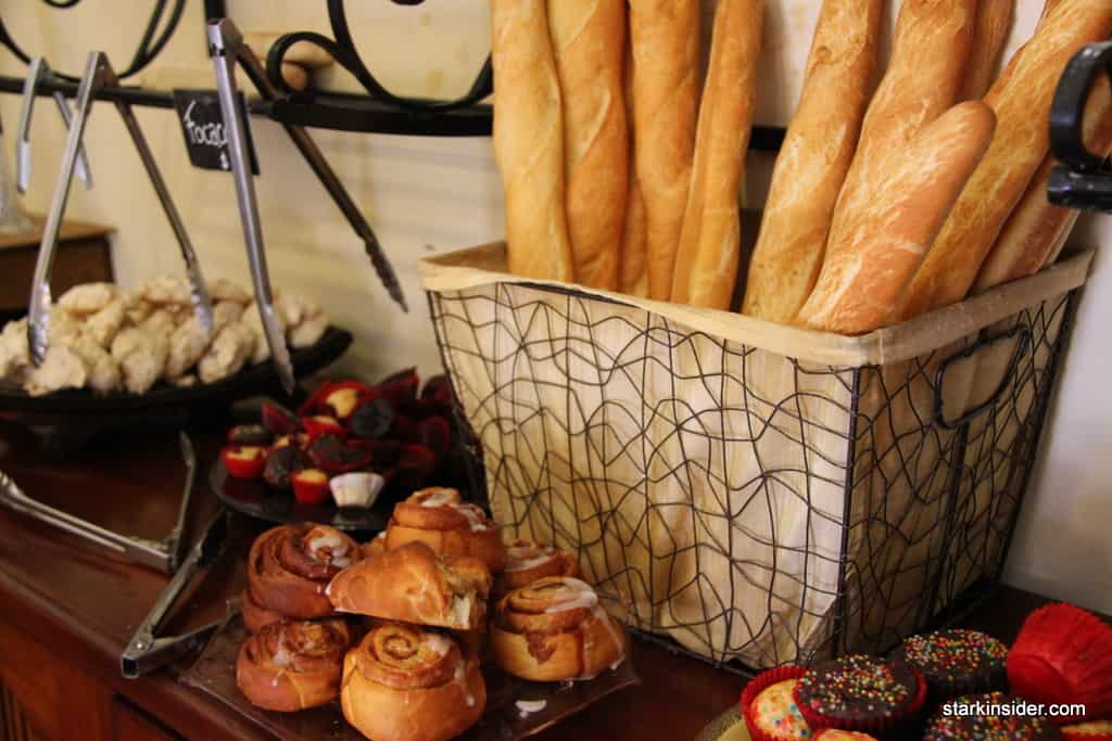 An iron stand stood tall and proud with the selection of breads. There were the long delicate silhouettes of French baguettes, the fat stout mounds of Foccacia and the tempting swirls of cinnamon rolls. Yet it is what they reveal to the nose that mesmerizes. Tongs and straw trays are provided to those that wish to pluck a couple of these baked goods to take home and enjoy. I even spotted a old gentleman with one of the French baguettes sticking out from his backpack as he walked along the sidewalk.