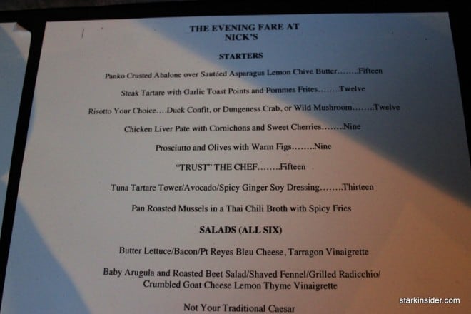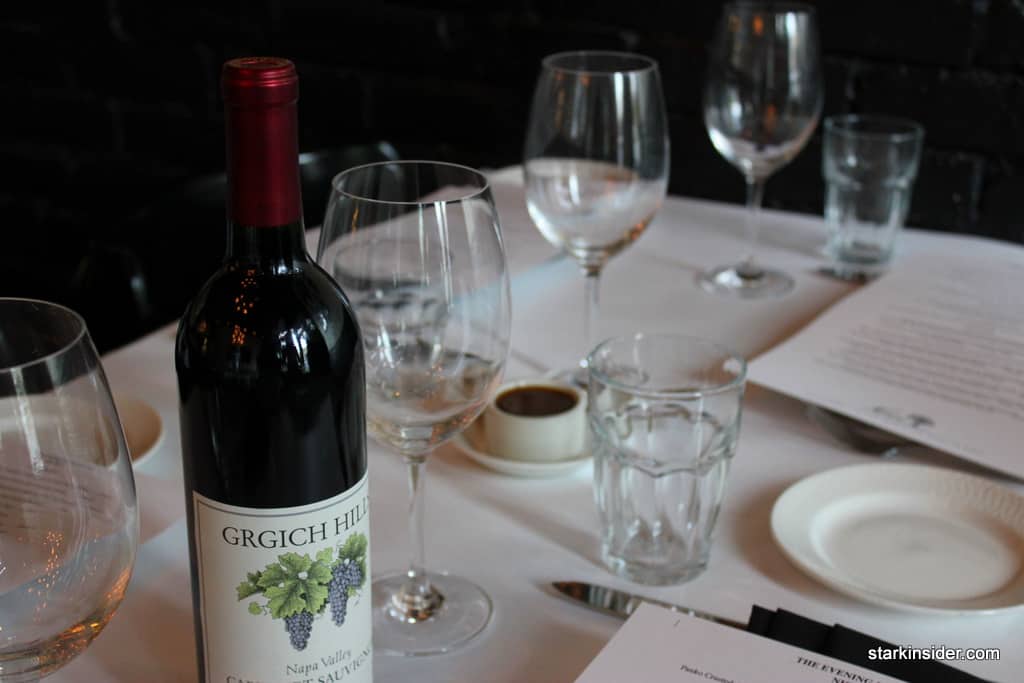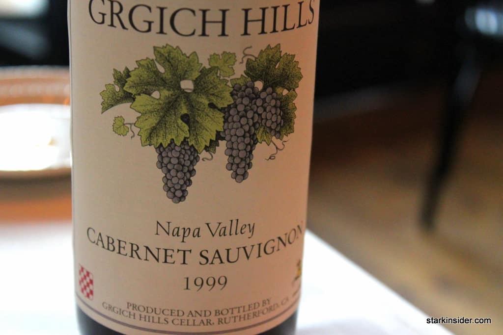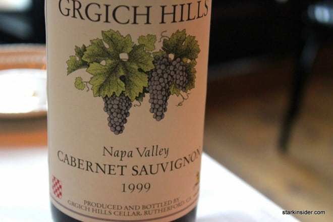 For the special occasion, I paired the dinner with a 1999 Grgich Hills Cabernet Sauvignon pulled from our wine cellar. Nick’s charges a very reasonable corkage fee.