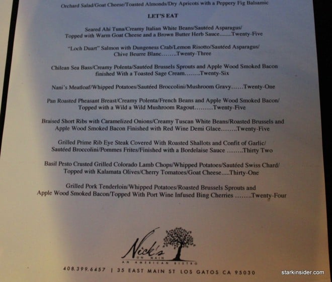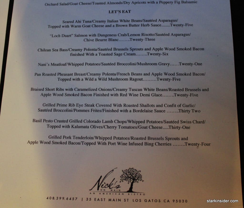 I stumbled upon Nick’s on Main in Los Gatos while scoping out restaurants for Clint’s “birthday dinner”. Clint has a couple of these birthday dinners a year, all clustered around his actual birth date.