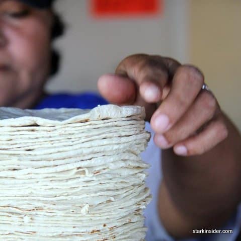 When you purchase a stack of these tortilla, you must quickly take one off the top, roll it up and have it fresh, soft and in its purest form. Nothing like a fresh of the press tortilla.