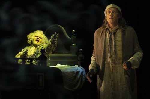 Each of the four ghosts that haunt the miser Ebenezer Scrooge and lead him to his transformation is theatrically staged: a children’s favorite, Scrooge’s former business partner, Jacob Marley (Willis), clad in chains, climbs out of Scrooge’s bed; the Ghost of Christmas Present (A.C.T. favorite Steven Anthony Jones) is a Bacchic spirit of fecundity and abundance, robed in striated green velvet; the Ghost of Christmas Past (member of the A.C.T. M.F.A. Program class of 2011 Marisa Duchowny, in her A.C.T. mainstage debut) is a candle, “lit from within, emanating radiance, who descends on a swing,” says Perloff; and the Ghost of Christmas Future is a giant black ghost puppet that takes over the entire stage of the American Conservatory Theater.