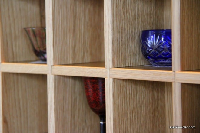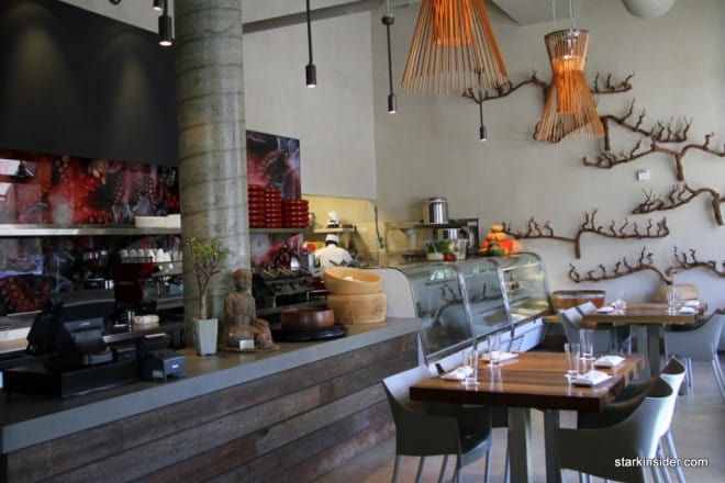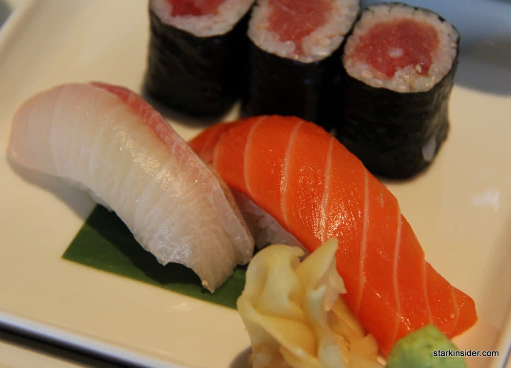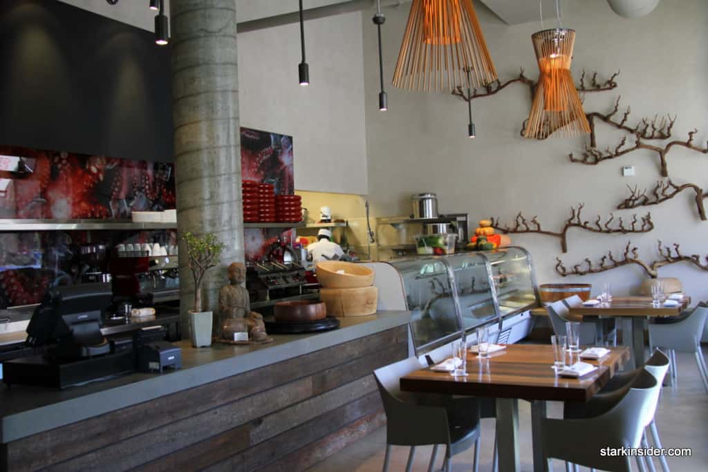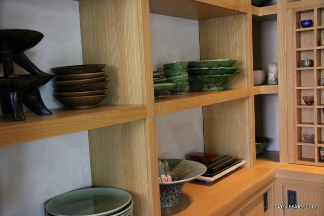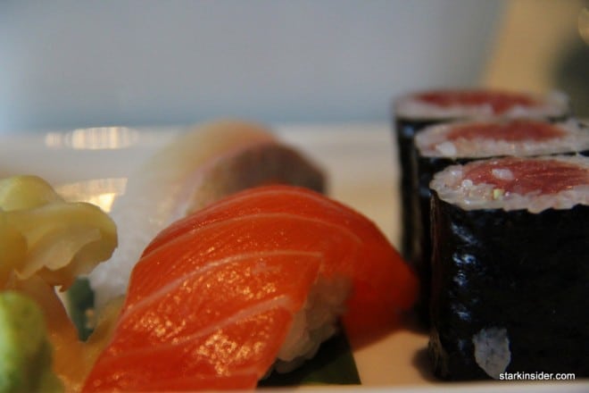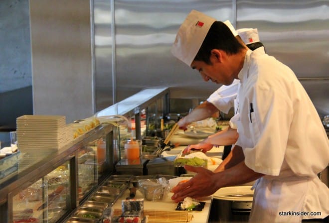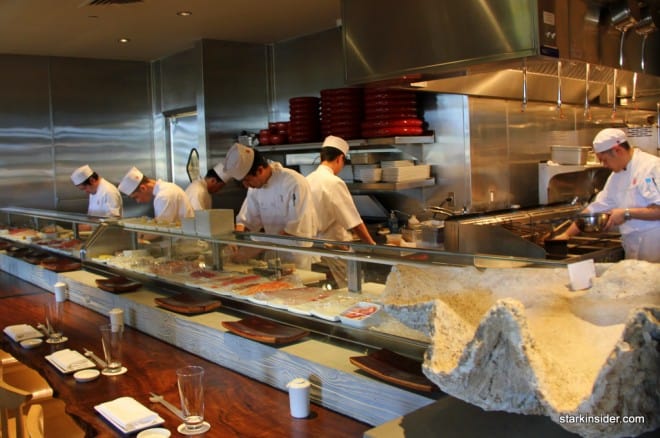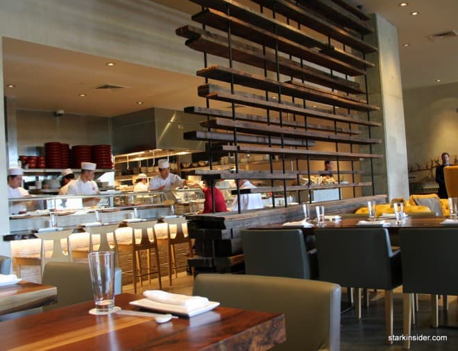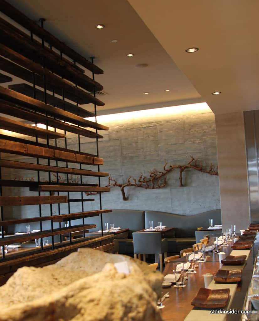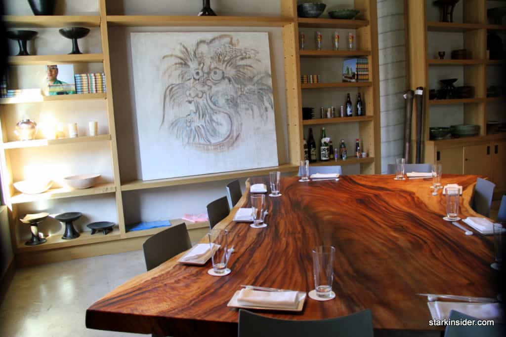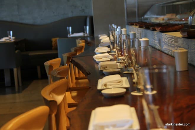 To the left of the entrance is a stately wooden table that seems cut from a single cross section of a giant tree. The twisted grain of the wood, elegantly finished with a clear lacquer proclaimed purpose and presence. To the right are a collection of rectangular tables and matte black curved chairs that suggest a less formal affair. A quick bite perhaps? A few choice selections from the sushi bar?