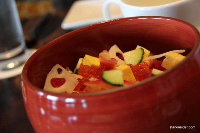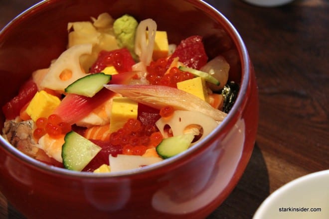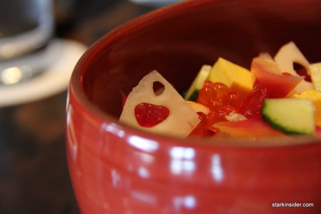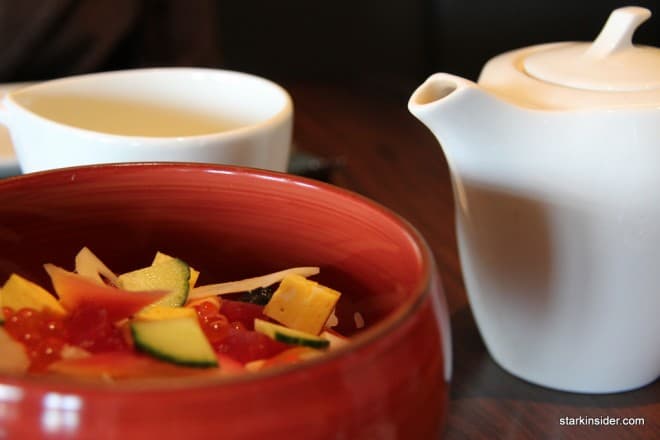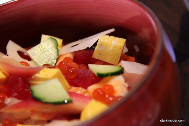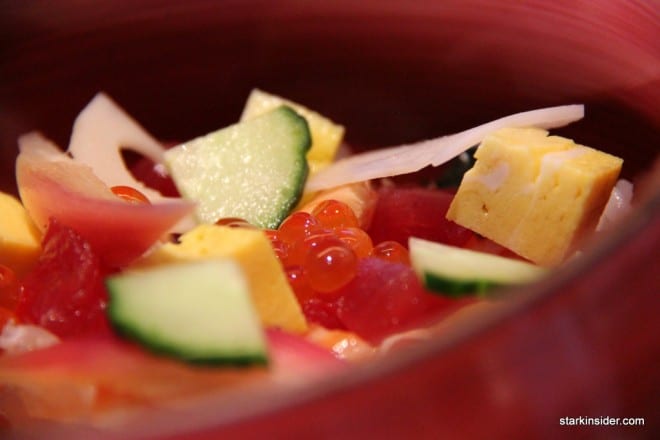The Chirashi Sushi was presented in a beautiful, deep red bowl. A long metal spoon made it clear that one must dig in to truly enjoy this Morimoto style dish.