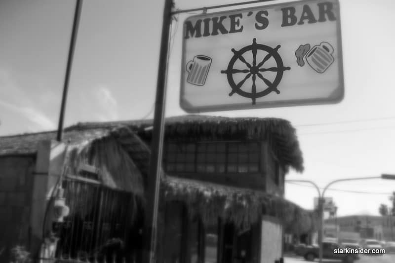 Years later, under a full moon and with a sizable thirst, I hobbled into Mike’s Bar. The Loreto Bay sales extravaganzas — those drunken pin-the-tail on the site map parties for gringos — were a distant memory, and the luster had worn off. On this evening the streets were filled with dust, noise, and exhaust fumes. The rain had let up a bit, but puddles dotted the streets, my shoes were soaked, and I was in search of a beer while Loni and a few friends hit the shops a few blocks away. The rusted sign with its frothy steins and ship wheel beckoned.