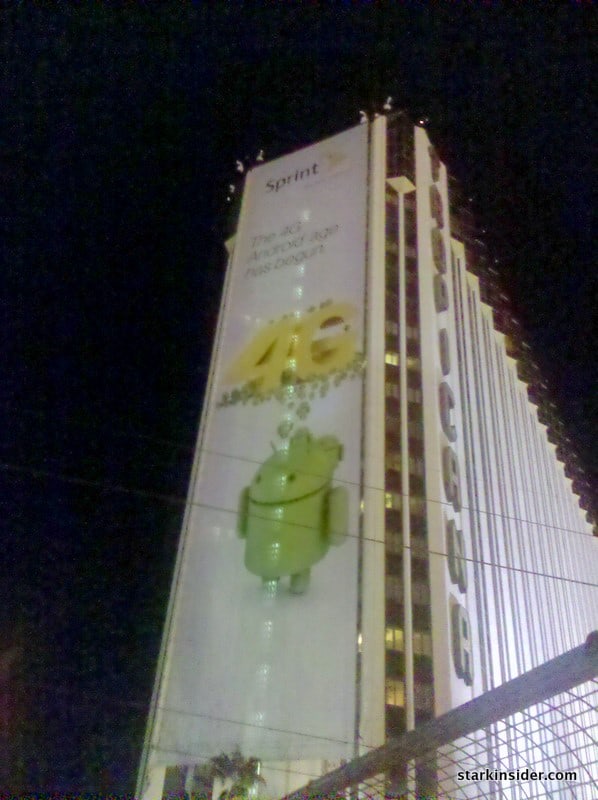 Billboard spotting continues here at CES Las Vegas. This time it’s Sprint and their could-be, would-be 4G service. Seen around town on buses, now it was spotted “hanging” or “standing tall” (take your pick) on the Tropicana hotel at the south end of the strip. It might be just us, or maybe it’s a bit of the afterglow thanks to some cool announcements that included the HTC EVO Shift 4G Android smartphone and assorted MiFi devices, but who doesn’t like an old-school banner or two?