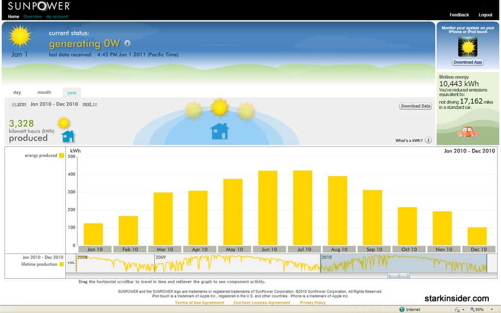 In 2010, our Sunpower solar energy panels generated3, 328 kilowatt hours of energy. This is down from 2009, when we generated 3,634 kilowatt hours from our 10 panel roof system.