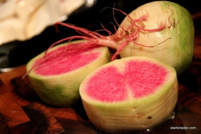 These are special radishes. Known as “watermelon radishes” they slightly milder and sweeter than the radishes one finds at standard grocery stories. Although you would think such a stunning beauty would be “designer”, it is actually a heirloom variety of daikon radishes originating from China.