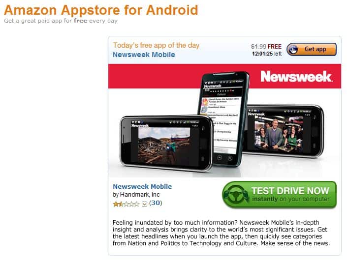 Another Amazon trick is the free app of the day. Each day you can download a freebie. The guys up in Seattle have fortunately decided not to heap on the crapware. There’s an app given away gratis every day. If you’re an Android fan than you definitely need to keep your eyes on this. Today, it’s Newsweek Mobile (with a most impressive 1.5 rating). Past titles included SwiftKey (a recommended keyboard replacement), Angry Birds Rio (no-brainer!), and World Series of Poker.