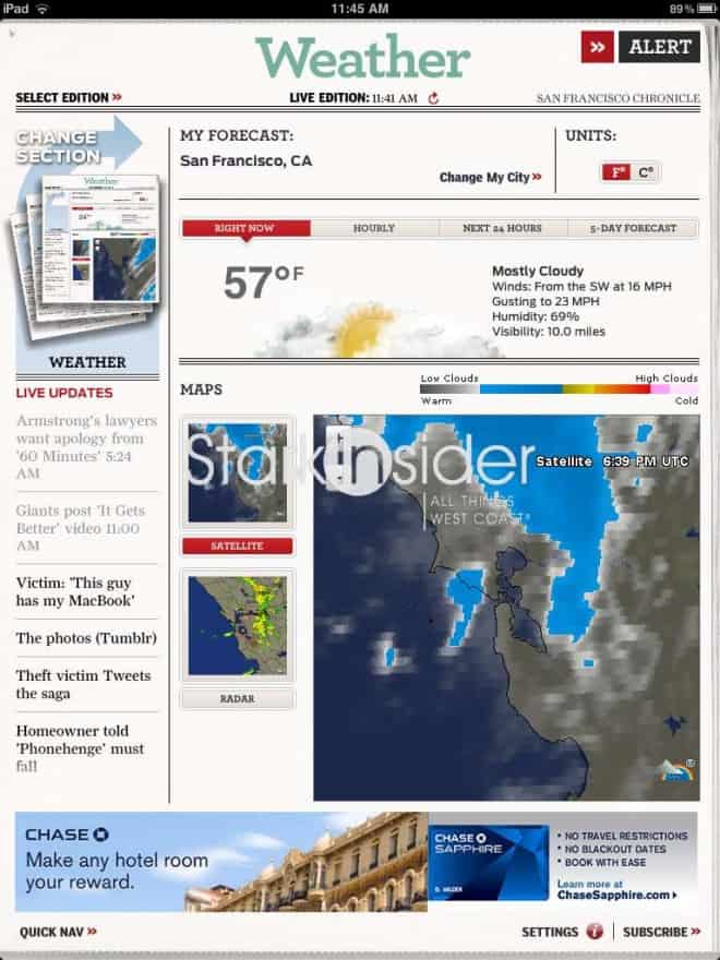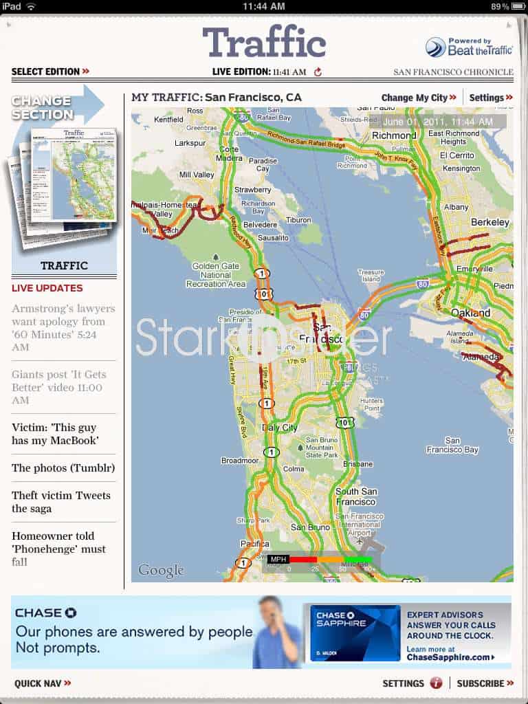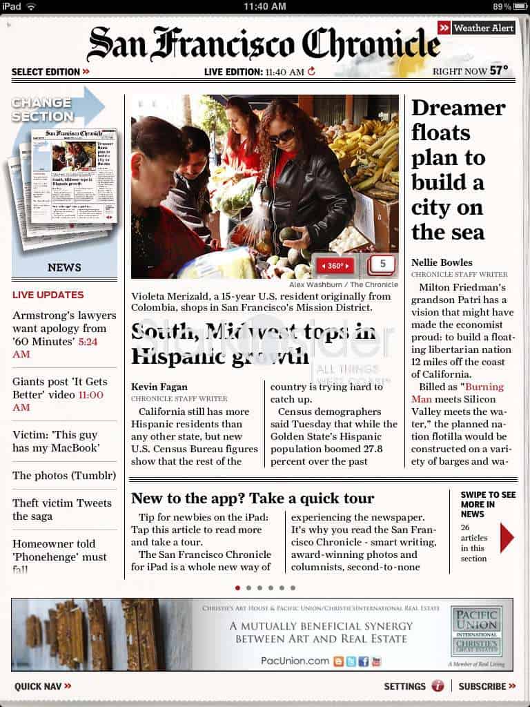 The San Francisco Chronicle is the latest newspaper to jump into the iPad app fray. Yesterday, a digital version of the Hearst-owned daily was made available in the Apple App store. Content is free for existing customers, and $5.99 per month for new subscribers. I don’t subscribe to the Chron (although I visit the web site almost everyday) but a free 30-day trial is available. So I downloaded the app and gave it a spin.