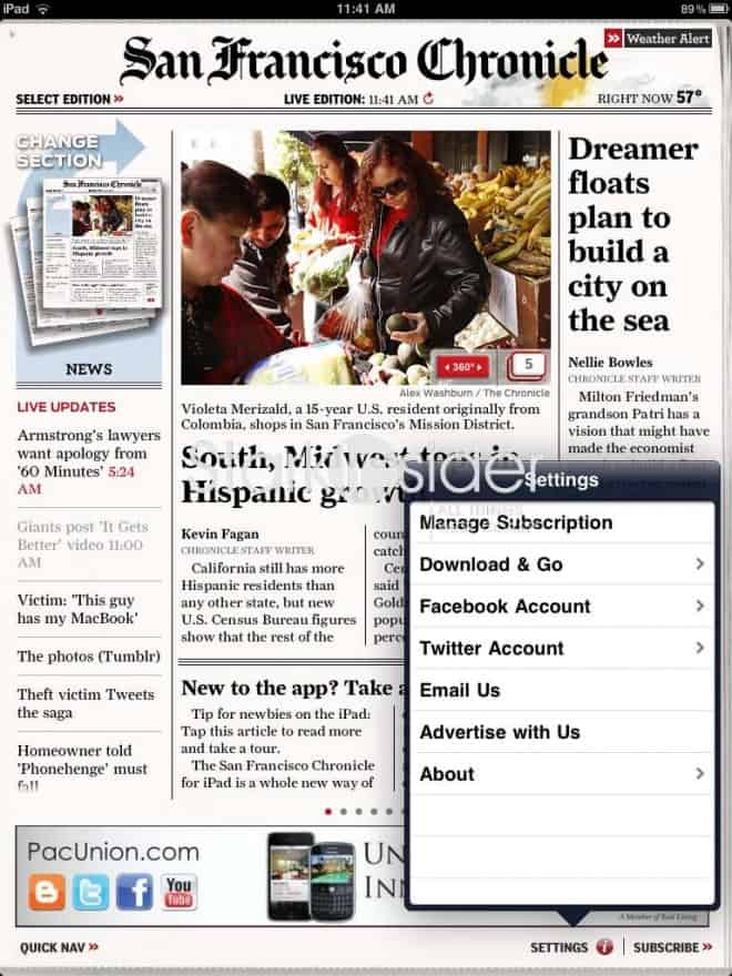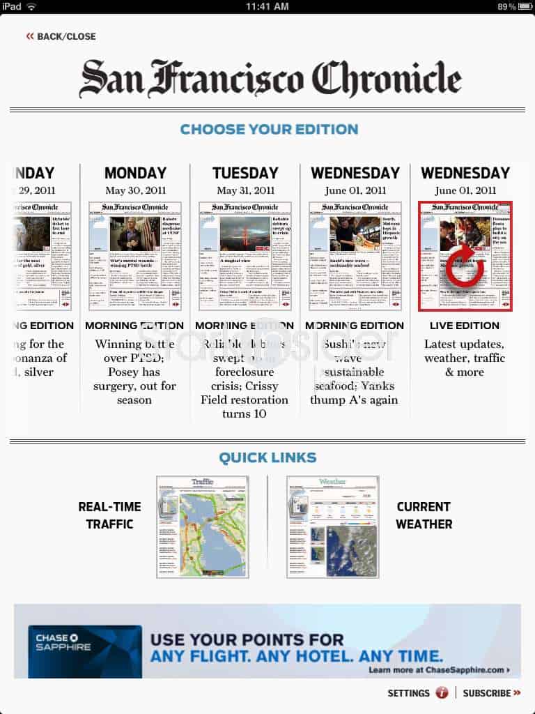 Like the fabulous Wall Street Journal app, the SF Chronicle is available in “editions”. Like their print counterparts these are static snapshots of the newspaper as it appeared first thing in the morning. The ideas it to mimic the traditional newspaper-reading experience. A “live edition” is also available that is refreshed throughout the day with the latest updates, weather and traffic. A button on the top-left opens a window that enables you to select an edition. From what I can tell during testing, the app provides access to the last 7 days. In addition, for those that want to read the paper on the go, and have limited or no Internet access, there is a “download and go” option which will copy the edition to your iPad. Using a slider you can specify how much data you want to bring down. It’s simple and I like the way this feature works.