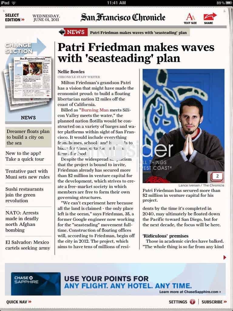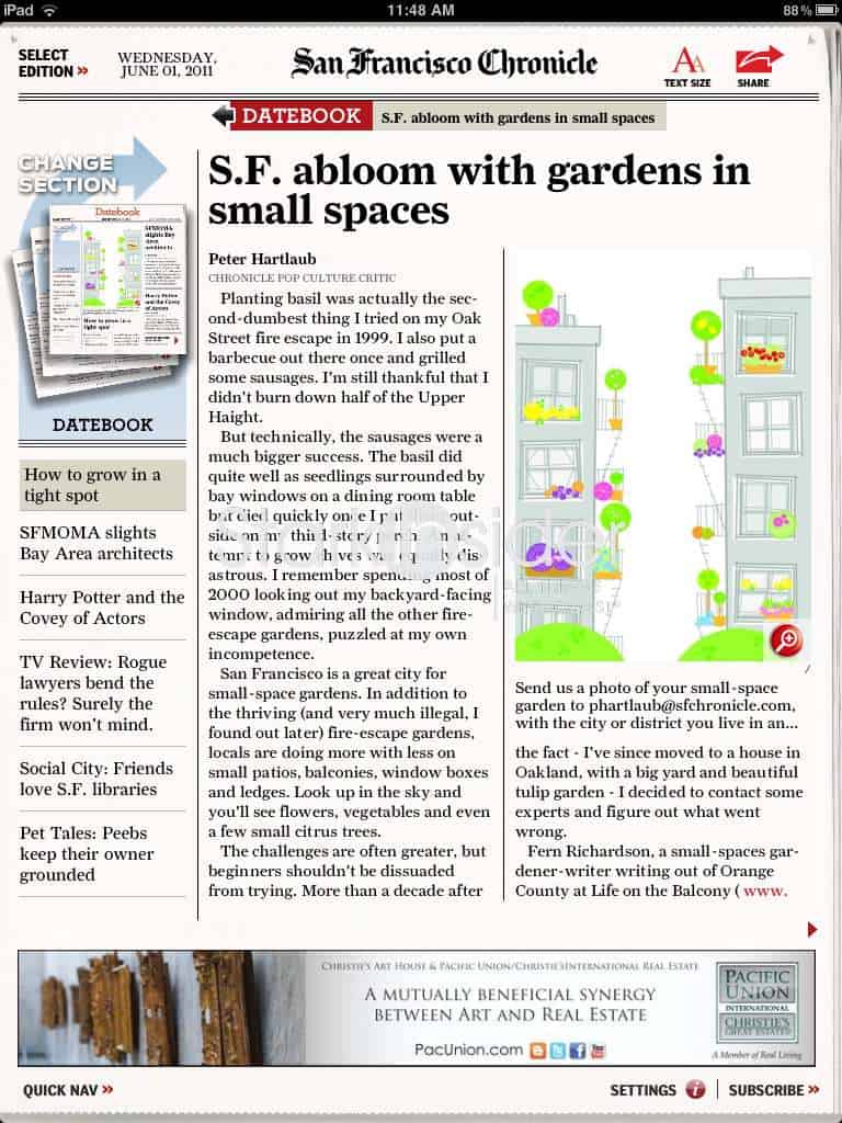 What I found was an efficient, pleasant enough experience consistent with most newspaper apps out there (USA Today, NYT, etc.). Overall, I was impressed and consider this a must have for existing subscribers. Those seeking multimedia fireworks and uber-slick graphics will obviously want to look to magazine apps, but if you’re looking for decent local news around the Bay Area with strong writing and editorial, you’ll most likely really enjoy reading it on the iPad.