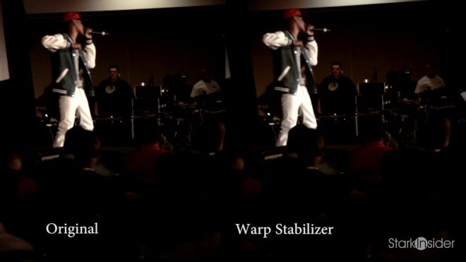 Warp Stabilizer took this previously unusable footage, and made it workable. Not that I’ll use it as you see here, but at least there is hope for this short clip. I was simply walking with the Canon T2i parallel to the stage, knowing that if I stabilization succeeded it might even look like a somewhat basic tracking shot of sorts. In this case you could call it the “rapper stabilizer.”