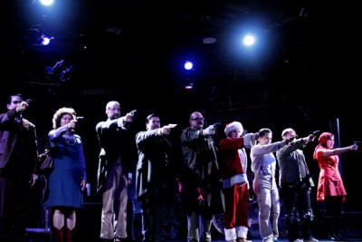 It’s staged as a musical revue with a unifying theme that examines the warped minds of nine notorious presidential killers (or would-be), from John Wilkes Booth to John Hinckley. The backdrop is a fairground shooting gallery (nicely rendered by scenic designer Maya Linke and lighting designer Cathie Anderson), run by the gun-toting “Proprietor” (played with vile charm by Steven Hess) who introduces us to a not-so-merry band of players whom he encourages to solve their personal agony by shooting the president (“Everybody’s Got the Right”).