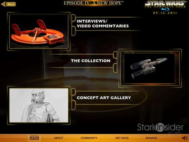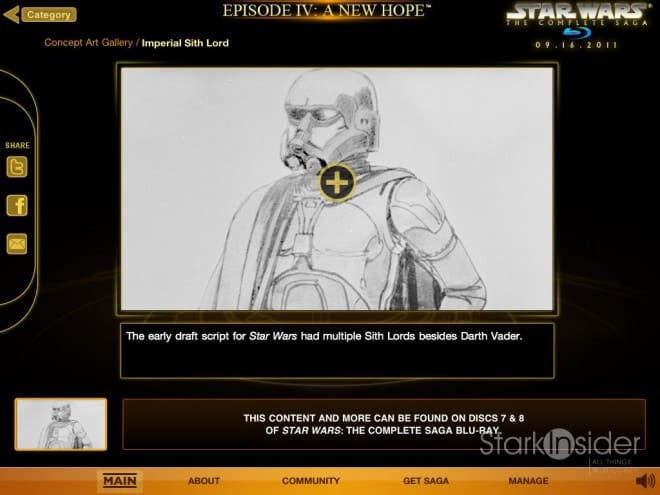 Content is organized by episode. Of course, I skipped directly to “4” (call me a slow learner, I still can’t get used to calling Star Wars “episode 4” or “A New Hope” … come on now!) . There I was able to watch a neat little video about the landspeeder and learn about the choices Lucas made to ensure the actors were still prominent while driving it.