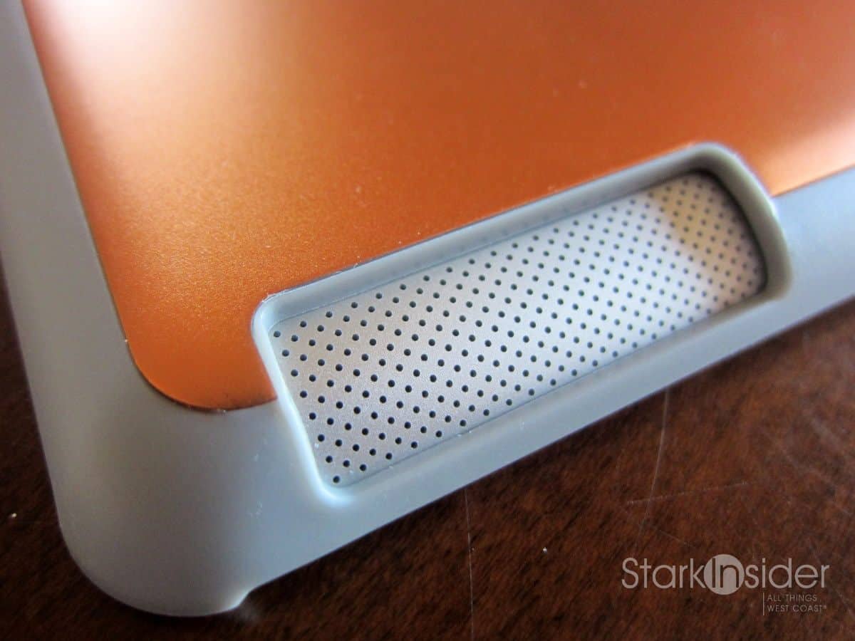 The plastic surround is rugged, and finished in a subtle grey, though we were less pleased with the look of it, especially next to the glossy surround of the iPad 2.
