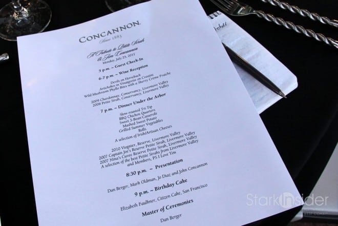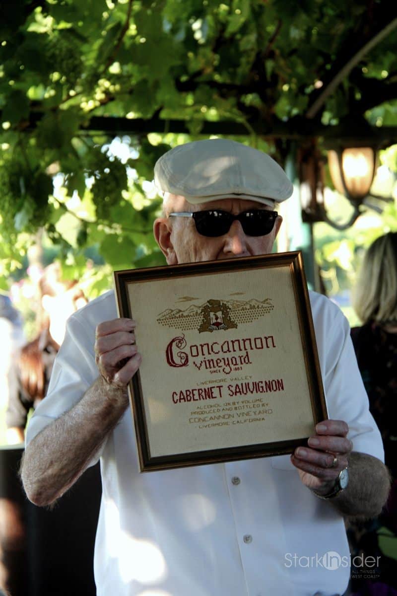 Monday evening, the scene was Conncanon Vineyard in Livermore. It was Jim Concannon’s 80th birthday, and we were invited along with trade, family and friends to celebrate. To mark the special occasion, that day when a contender was born, the tribute also marked the 50th birthday of petite sirah.