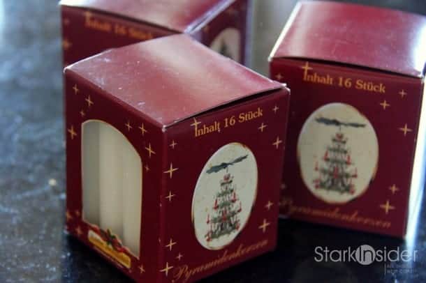 A moment of great anticipation as my knife slices apart the tape to review the box full of Christmas goodies that made it all the way from Germany. It came a couple of weeks after I returned and only a couple of months later did yours truly finally have the time to both open and document the experience.This box includes the little white candles for the Christmas Pyramid. I decided to get 3 boxes of these candles since I figured it may be a pain to try to get the right kind here in the US. I was fearful they would be melted. A collegue of mine also purchased a Christmas Pyramid and received it with melted candles.Sigh of relief! My little white candles are in perfect condition. Now onto opening the actual Christmas Pyramid!Another box encasses the prized Christmas Pyramid.Oh dear! It looks like Scrooge showed up early this year. When I gently lifted the pyramid from the box, I realized that it had been a very rough ride for Santa, the angel and lamb. They didn't only go round-and-round, but up-and-down and all around on this trip.Even as I assessed the damage, I marvelled at the delicate and intricate pieces that make up the pyramid.The little lamb is one of my favorite pieces, so small and I love the white texture of the wool.Thinking I can take a glue gun or crazy glue to most of the pieces, this broken piece off the fan on top made me reconsider and contacting the company to get a replacement.Another shot of the Christmas Pyramid chaos.Thankfully the ornaments I purchased came in perfect condition.