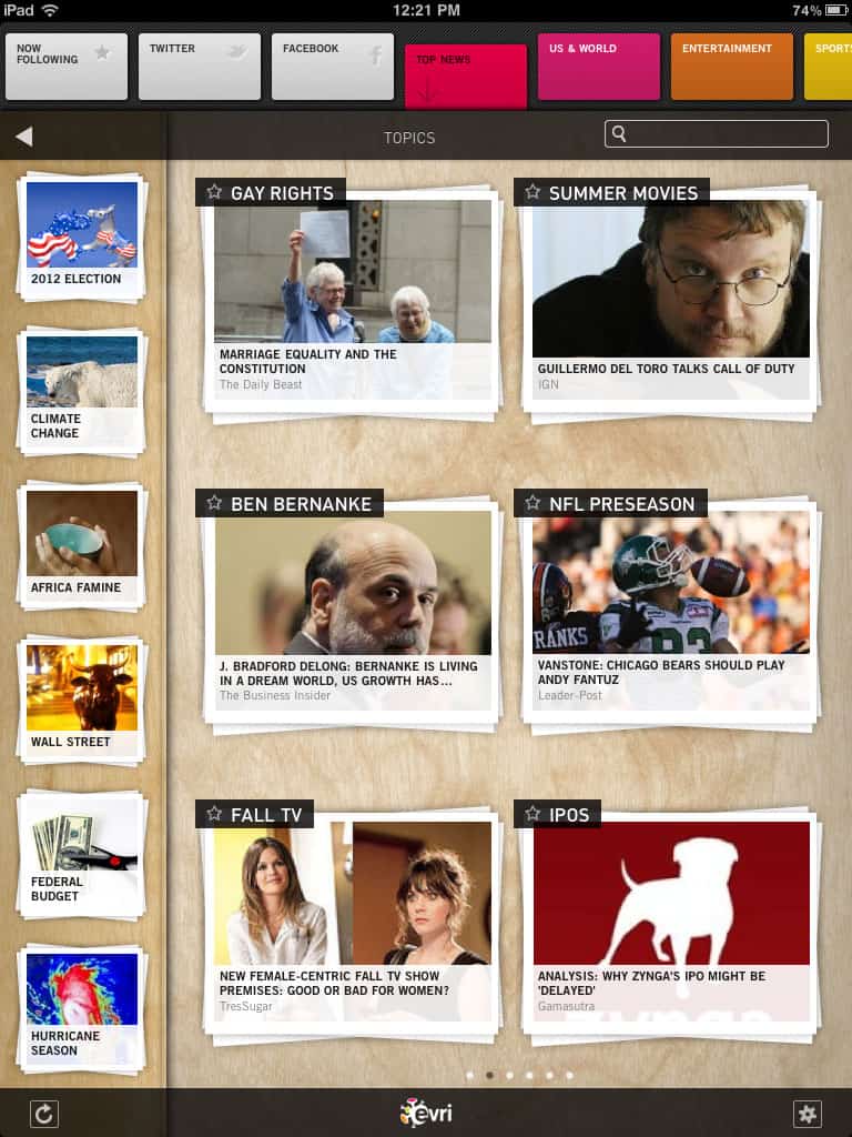 WH: Evri is a content discovery platform, we distill content from over 15,000 sources into over 2.5 Million topics (at last count) and enable a “never ending” discovery experience coupled with the ability to personalize based on the topics you are most passionate about. With Evri for iPad, we expose trending topics based on popularity, velocity and social signals, enable users to follow any of the 2.5+MM topics, make related topic recommendations throughout the experience as well as providing background information, and structured data about a topic. We filter by content category to enable users to see what news is trending in Sports, Technology, US&World etc but also allow users to find detailed information about “tail” topics through our topic-based search – something no other news discovery app provides. We are about personalized Discovery, without the limitations of source based or human curated content feeds.