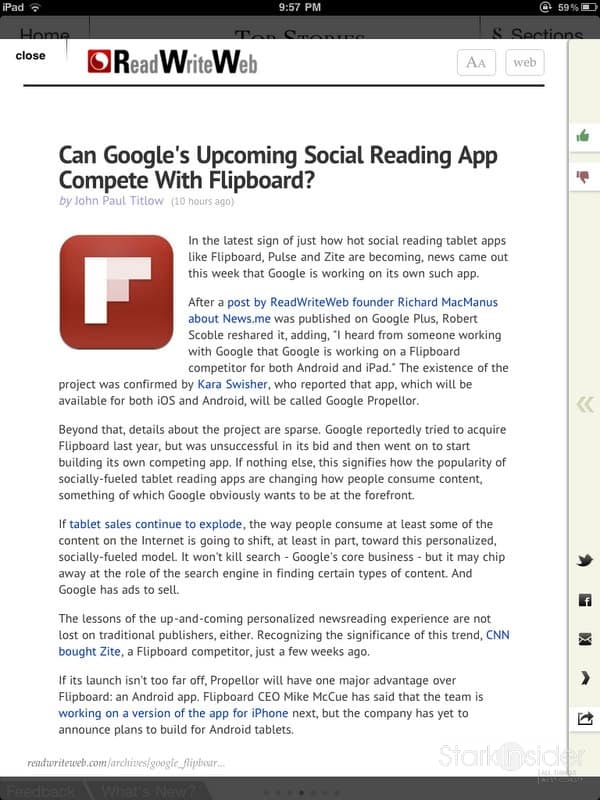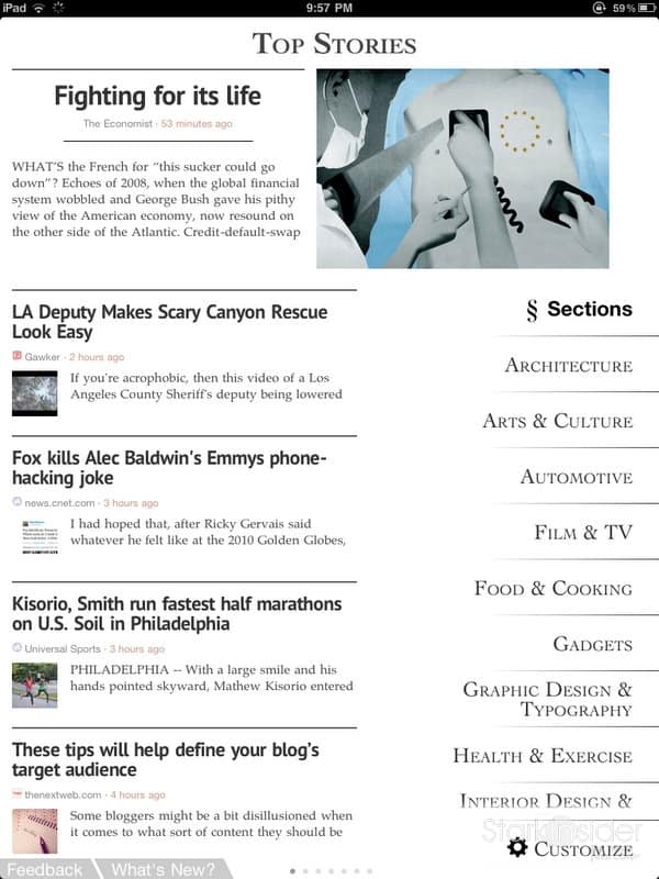What Zite gives way for sexiness (there are no fancy page curls), it makes up for in personalization. And this is what I love about Zite: you can give content and articles Ebert-inspired thumbs-up or thumbs-down ratings. In addition, you can tell Zite to “Give me more from…” and “Give me more about…” It’s intuitive and habit forming.
