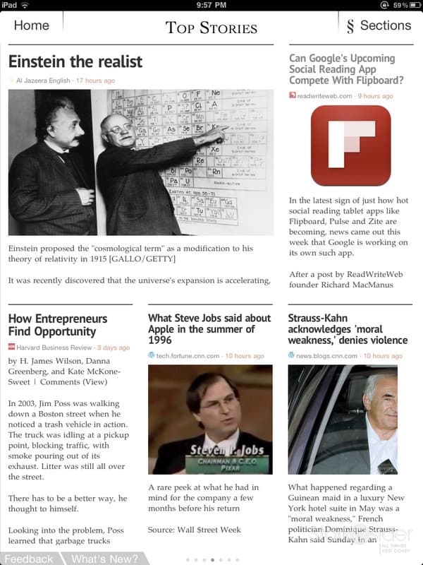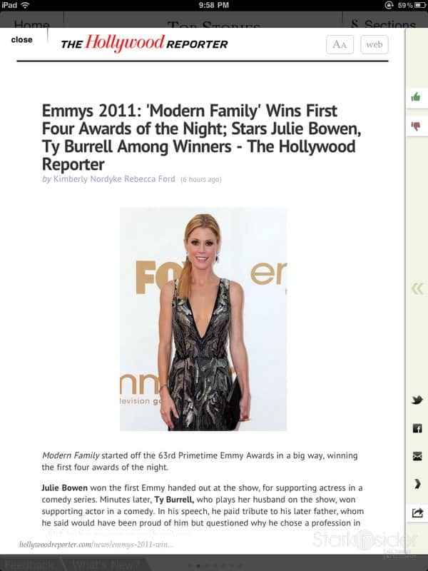 One of my favorite aspects of Zite is its speed. It’s fast. When I clicked on a Chrome 14 article by zdnet.com, for example, it pulled up almost instantly, including a thumbnail image and the full article in-line. No need to pull up Safari. My experience was similar across other articles too.