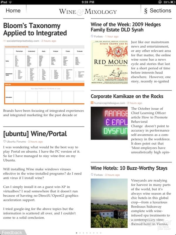 Zite enables you to create a customized “magazine.” You select favorite topics (World News, Politics, Technology, Food & Cooking, Film & TV, Sports, etc.) by clicking on the included selections. It works well. With a single touch I was able to highlight favorites, and in a flash those sections were added to my personalized mag.
