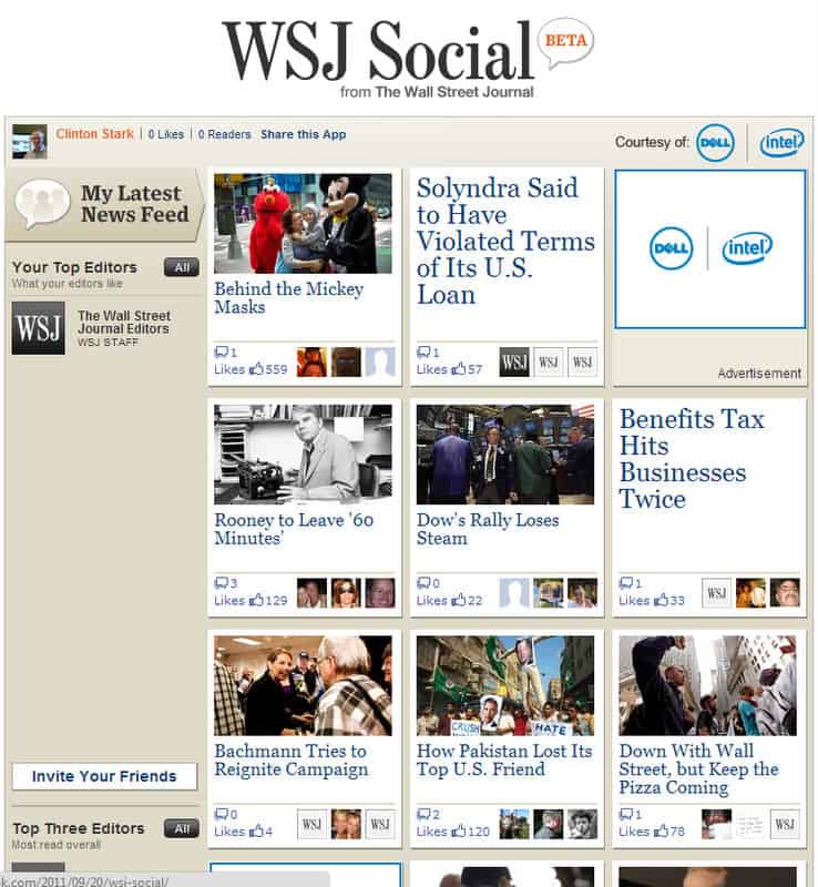 About that WSJ beta app. It looks a bit like Pulse, quite grid-like. When you first pull up the page on Facebook, the latest headlines are rendered in 12 tiles. From there it’s second nature. Click on a tile to pull up a story. Like it (surprise) if you will. Comment on it.