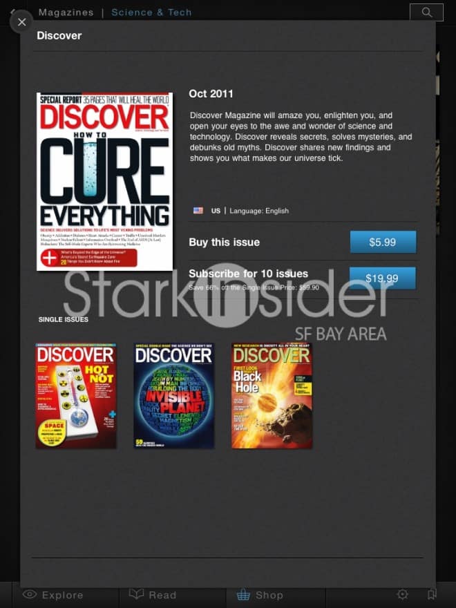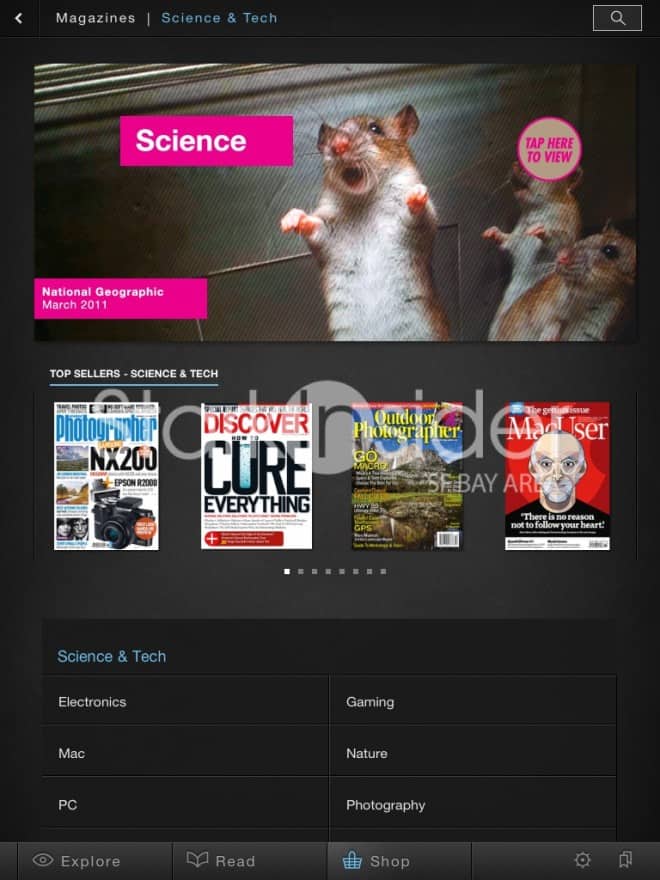 Three things: explore (free articles), read (stuff you’ve bought), and shop (for new issues).