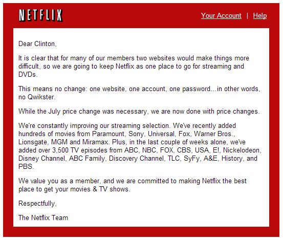 Interesting how this email is so curt and signed “The Neflix Team”. So much for the personal Hastings touch.