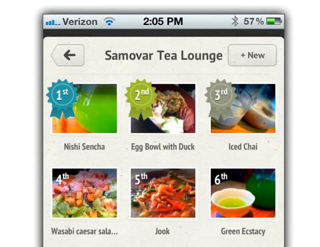 During the demo, Samovar Tea Lounge was used as an example. Log into Oink on an iPhone and–how refreshing–you don’t see maps, contact information or even any social discussion. Instead you get a top 10 list of sorts- a list of popular items; in this case the favorite dishes at Samovar (Nishi Sencha is #1).