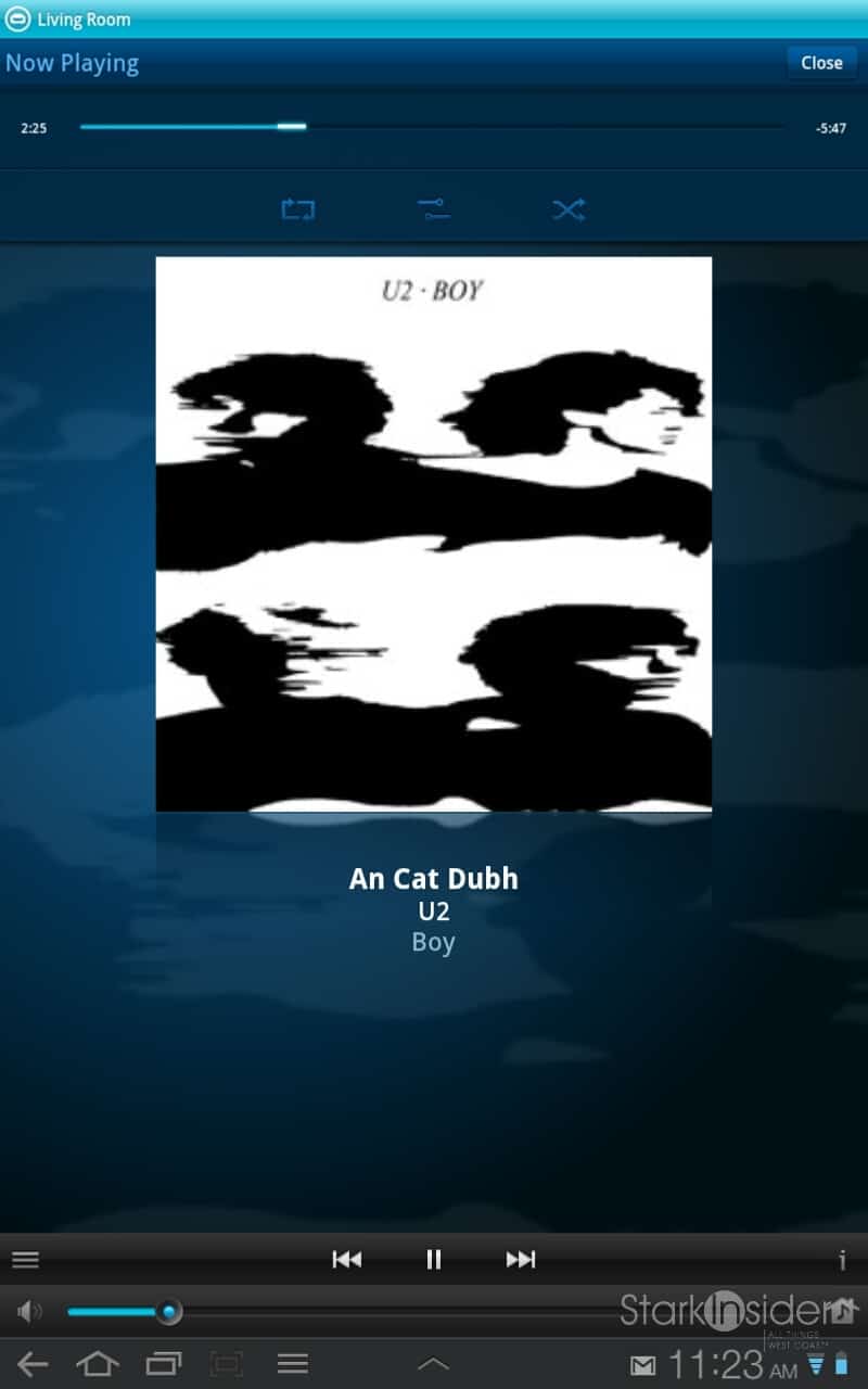 Thankfully now takes advantage of the larger real estate afforded by tablets, primarily in the form of album art which looks generally pleasing, up front and center. Oddly, text is still somewhat small on some screens, and occupies about 10-15% of screen real estate in the top left. I’m not sure why Sonos doesn’t take advantage of the extra space which sits wasted with a subtle blue gradiated background. Another nit: this is not a gesture/swipe-friend app. Even a third party app for controlling the Logitech Media Server (formerly Squeezebox) such as Squeeze Commander takes advantage of gestures, allowing easy swiping from “now playing” to “music library” to “playlist,” etc. Sonos would do well for a 4.0 update that embraces these now-mainstream UI elements.