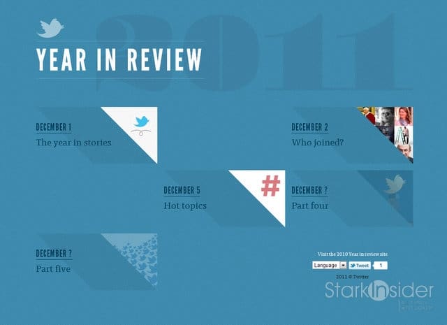 Click here to browse through Twitter’s somewhat Pinterest-like slideshow of the year in review. The first three entries–The year in stories, Who joined?, Hot topics–in the five-part series are now live, with two more to come sometime this month. Oh, the suspense!