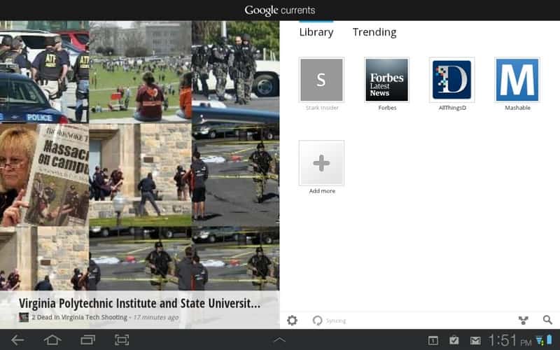 Ironically, the hardest part I encountered was actually downloading the Google Currents app itself. I could not find it using search on Android Market (using both a Moto Droid, and Samsung Galaxy Tab 10.1). When I tried to use the direct link from the Google blog post, that worked, but the app would not install. Try, try again. Eventually it worked.