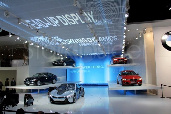 Speaking of looks. Red dresses. Red flowers. The models (the human kind) at Porsche get my vote for best in show. BMW meanwhile went tech, using their multi-level booth to dazzle with all sorts of modern effects.