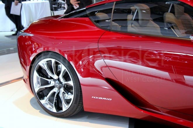 Despite the constant-challenged-and-hyphenated model designation, our jaws were collectively on the floor here at the Detroit Auto Show. Soon after the presentation the car was quietly brought back down to the main show floor. Fortunately I was hanging by the espresso station, talking with staffers about the dramatic LCA supercar, another head turner (but not a hybrid).