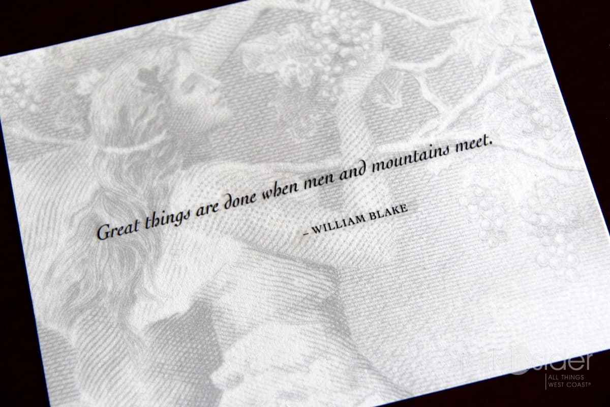 Inside was a card, with “Harlan Estate” elegantly embossed in all caps on the cover. I flipped it open, and I was greeted by sure inspiration in the form of a quote, set against the image of a grape goddess/angel (or something like that):