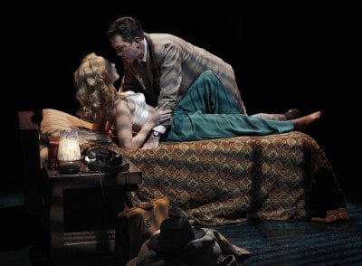 San Jose Rep’s season turned bold this week with the world premiere of Double Indemnity. Based on the classic 1943 crime novel (later turned into a hit film), noir scorches the stage. Heavy on style — costumes, set, lighting — and well paced it’s a delicious way to spend two hours. Strolling down the rain-soaked Paseo de San Antonio to the Rep, I wondered if I was in for a staid adaptation, the kind where sets are predictably boxy, and lines are delivered with campy 1930s gusto. However, the minute scheming insurance agent Walter Huff (John Bogar in an dynamic, entertaining performance) appears, gasping and bleeding, at the bow of a luxury liner I knew this was going to be anything but dull.
