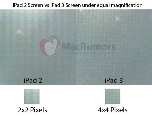 MacRumors posted a 2×2 pixel comparison of a close-up of the iPad 2 and iPad 3 resolution (see above).