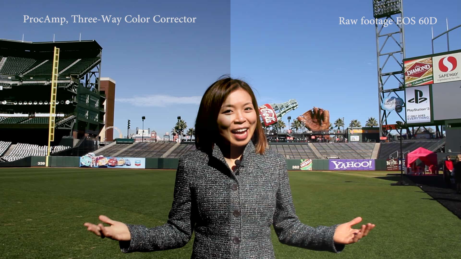For editing, we use Adobe Premiere Pro. Here, I’ve done some basic color correction. For those that know their effects, ProcAmp and Three-Way Color Corrector – look at the end of the reel (about 0:50) to see a before after look of how I’ve boosted contrast, increased the green of the AT&T Park grass, and generally tried to make the final image look less like traditional news video.