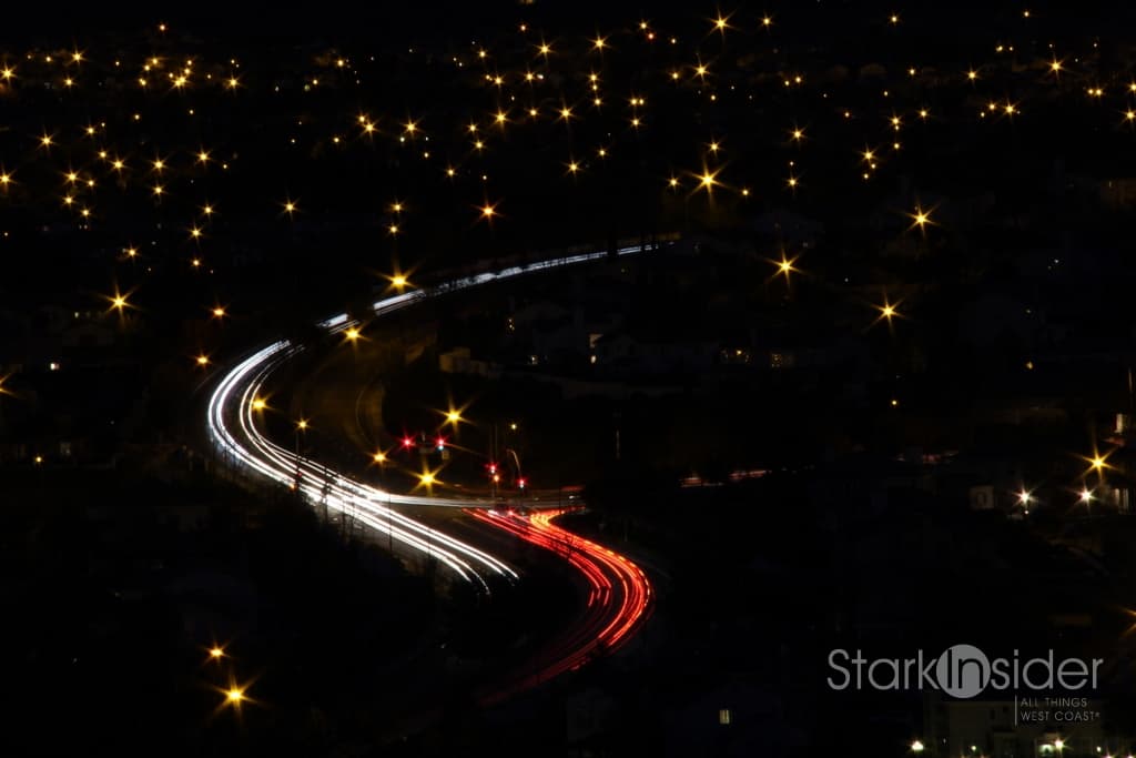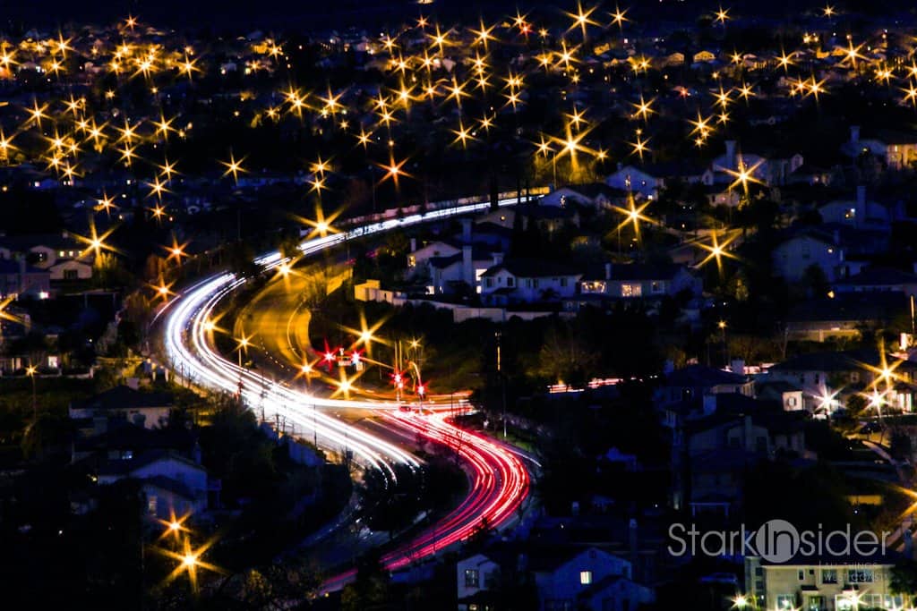 I’m generally pleased with the result. The colors really pop. There’s a lot of action, and drama. Neighborhoods are visible now. I like the contrast of the quiet homes, against the bustling streets. Not everything is perfect. There’s noise in the shadows; I likely boosted too much (capturing RAW would’ve helped). And the star bursts seen across all the street lights might be a bit much. Still, I was going for over-the-top. There’s room for improvement and further learning. Isn’t that always the case with photography?