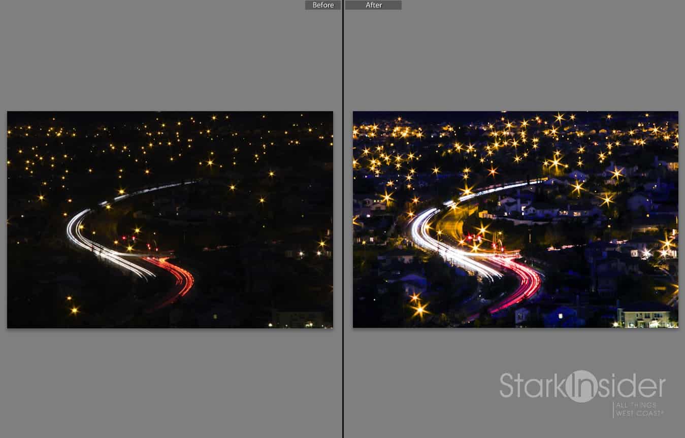 The before shot is okay. Nothing too catchy. I like the red and white streaks from the cars. But I wanted more drama. More sizzle; something you might see in a magazine, maybe related to an article talking about nightlife in San Jose or San Francisco.