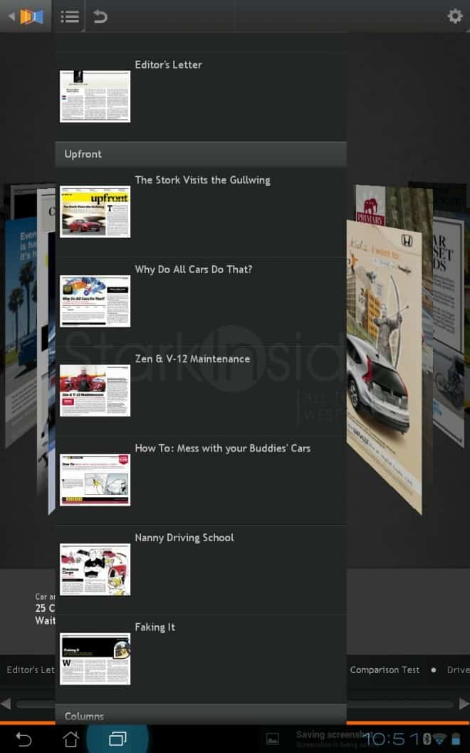 So I choose Car & Driver. The most logical offering amongst a sea of dread, and wickedly insipid gloss (New Yorker and Time excluded). After a force close, I was presented with a back catalog of C&D issues- not unlike what we’ve seen before on Zinio or Apple newsstand. That was followed by a visit to download hell. For whatever the reason (it wasn’t our wi-fi connection) downloading an issue took eons. And a few force closes. The responsiveness during this process was abysmal. Be it the fault of Next Issue, Android 4 ICS, or the Transformer Prime, I have no idea. Maybe their servers are under seige today. Regardless, I stuck with it, and after multiple attempts had the April issue of C&D.