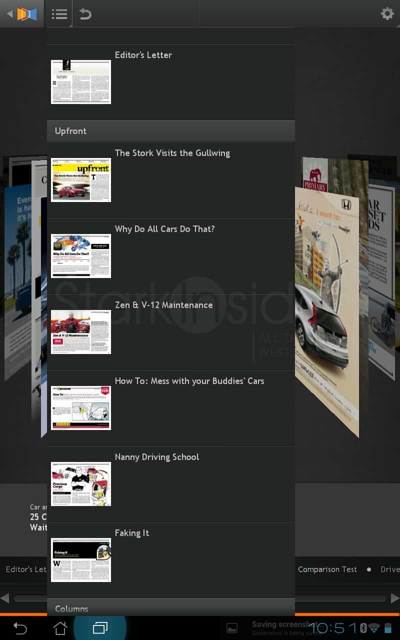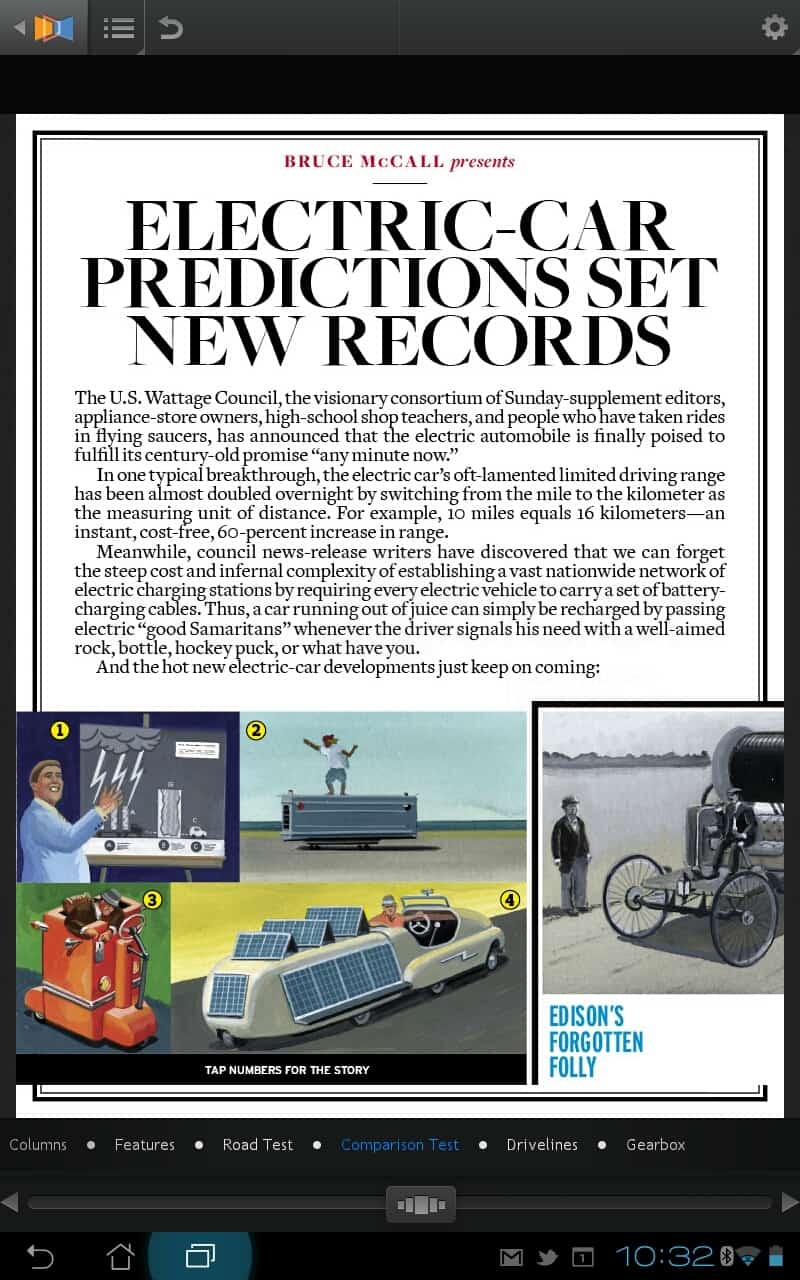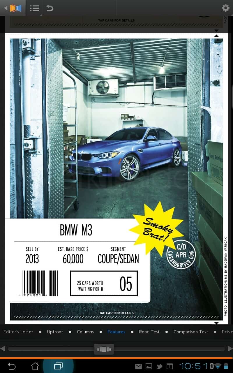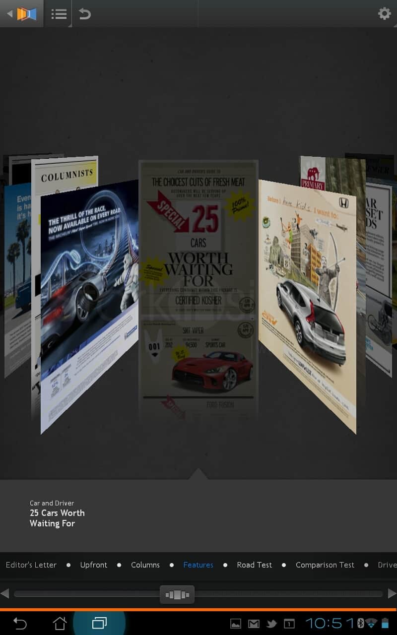 Ultimately, Next Issue performs like so many Android tablet apps: poorly. The iPad version can’t come soon enough. I find it odd they’d launch on Android. As much as I like Android smartphones (I’m still on trusty OG Droid contemplating an upgrade dilemma: HTC One X, Droid Fighter, or Samsung S III) the tablet experience – Gingerbread and ICS – is rough going compared to iOS. Next Issue is right. Once the crashes subsided, and the April issue had fully downloaded, however, I did enjoy the reading experience, especially C&D’s “25 Cars Worth Waiting For.”