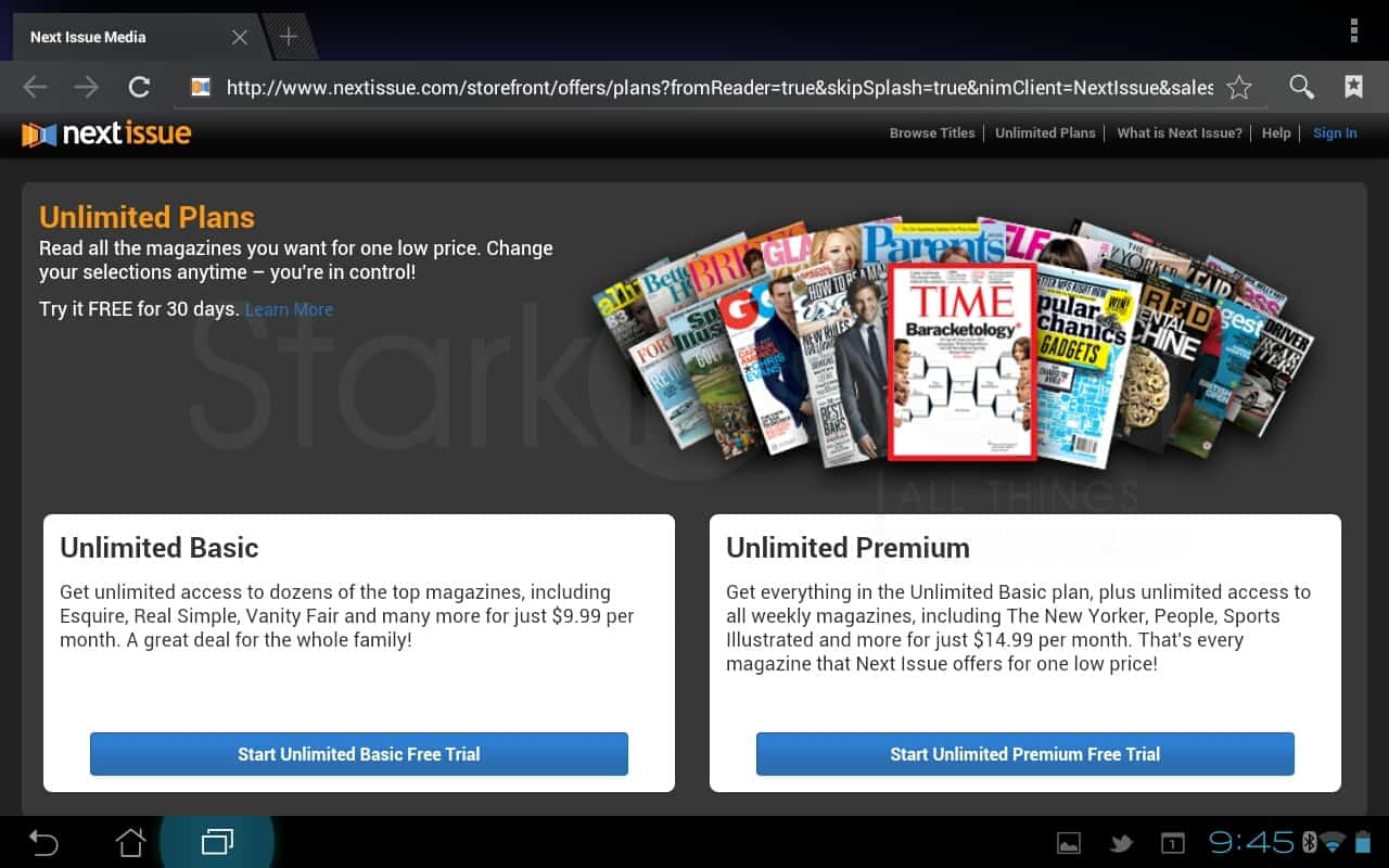 To sign-up, you’ll need to head to the Next Issue web site, and, yes, you’ll need to provide a credit card even to test drive the service for 30 days. I chose the premium plan ($14.99/month). I’m a big fan of Apple’s newsstand and other digital magazine apps, such as Zinio (review) and Rupert Murdoch’s The Daily. Unlike those, Next Issue promises an all-you-can-eat model; though the real upstart in the space most likely to bring revolution is Flipboard (review).