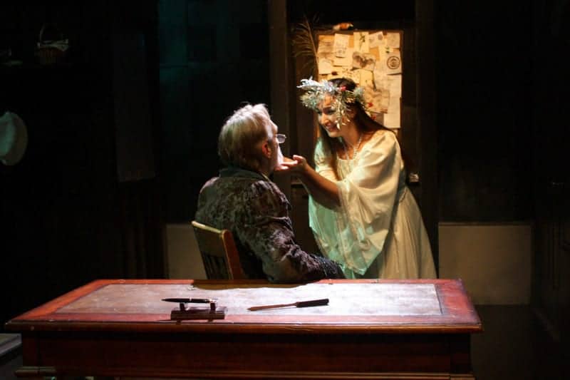 “The Black Glove” was not as fast-paced as “The Pelican.” Although program notes claim that this is the most cheerful and redemptive of the five chamber plays, its focus on a missing infant presumed to be dead, and a dying old man who realizes his life has been misspent are hardly uplifting. My response isn’t entirely related to this particular production. Perhaps there should be a moratorium this month on plays involving slain or kidnapped children. The horrific moment in which the wife of CBS exec Kevin Krim found her slain children in Manhattan earlier this week is still fresh in our minds. Using the disappearance of a child to teach some kind of moral lesson or whatever Strindberg was trying to achieve only seems grossly self-serving. That said, David Sinaiko’a masterful performance as Yule-Tomte goes a long way toward redeeming this work.