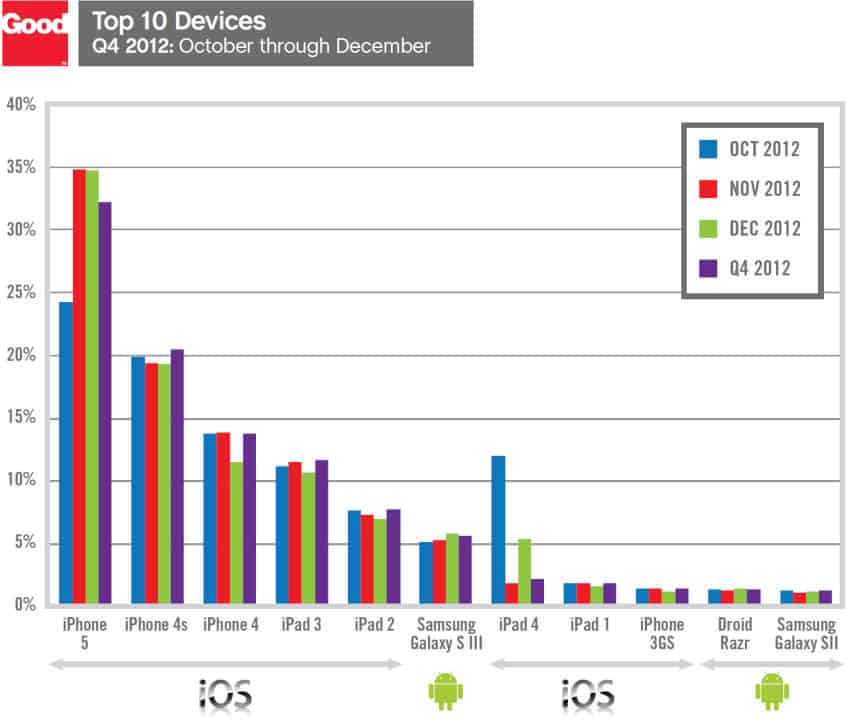 Its just released Q4 2012 Device Activation Report shows a clear preference for iOS devices among corporations, with the iPhone 5, iPhone 4s and iPhone taking the top three spots. The data is based on activations within Good’s customer based which includes half of the Fortune 100.